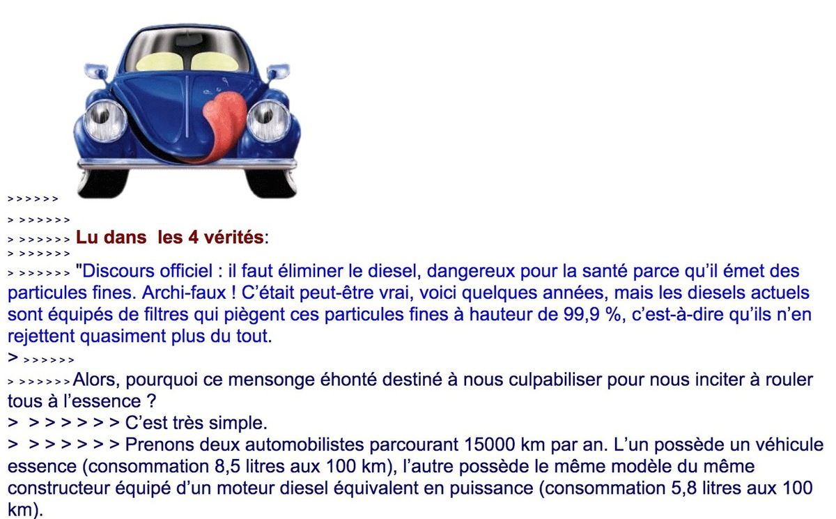 Bizarre quand même qu'après les prouesses technologiques des constructeurs, les énormes sommes investies dans la recherche pour rendre la pollution du diesel au minima, ces efforts semblent passer à la trappe, pollution bien moindre que l'essence, cette essence qui est à l'origine de "l'explosion" du diesel, justement, dans les années 1975/80.